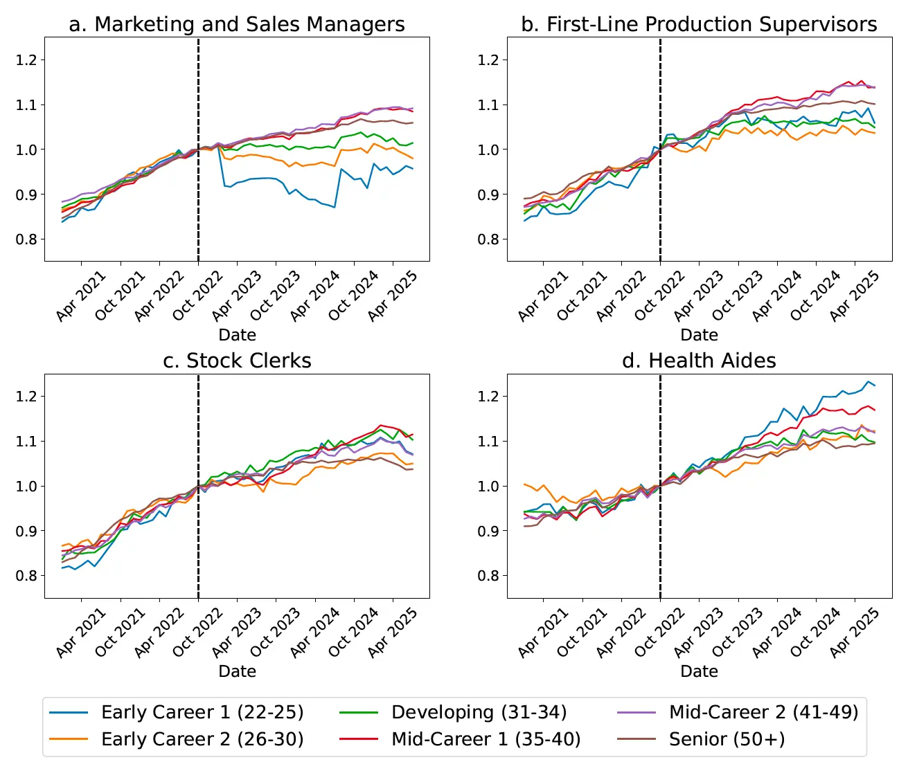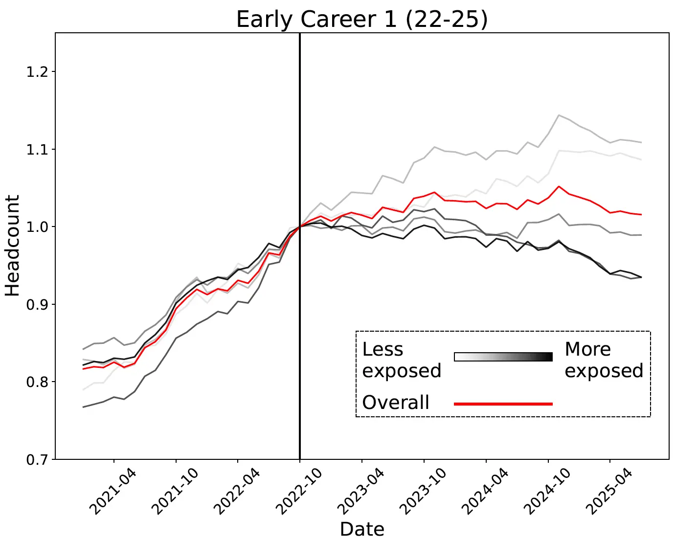 软件开发人员:以22至25岁的软件开发人员为例,截至2025年7月,该群体雇员人数较2022年底的峰值下降近20%