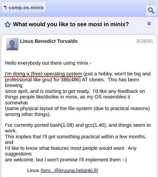 这个项目就是 Linux 内核。当时,21 岁的 Linus Torvalds 说,这只是个业余爱好,不会做大做强,也不会成为专业的项目,很显然他错了。