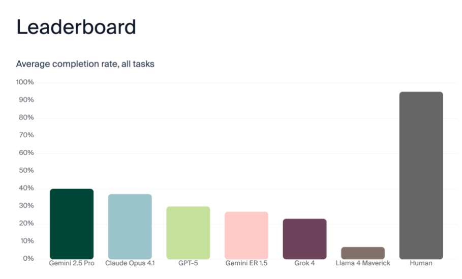 然而结果表明,这些先进的机器人在执行任务时的成功率远远低于人类,具体数据显示,Gemini2.5Pro 的成功率仅为40%,Claude Opus4.1为37%,而 GPT-5更是低至30%。这些数字表明,尽管它们具备强大的文本生成能力,但在实际的空间推理、环境理解和长期任务规划等领域仍显得力不从心。